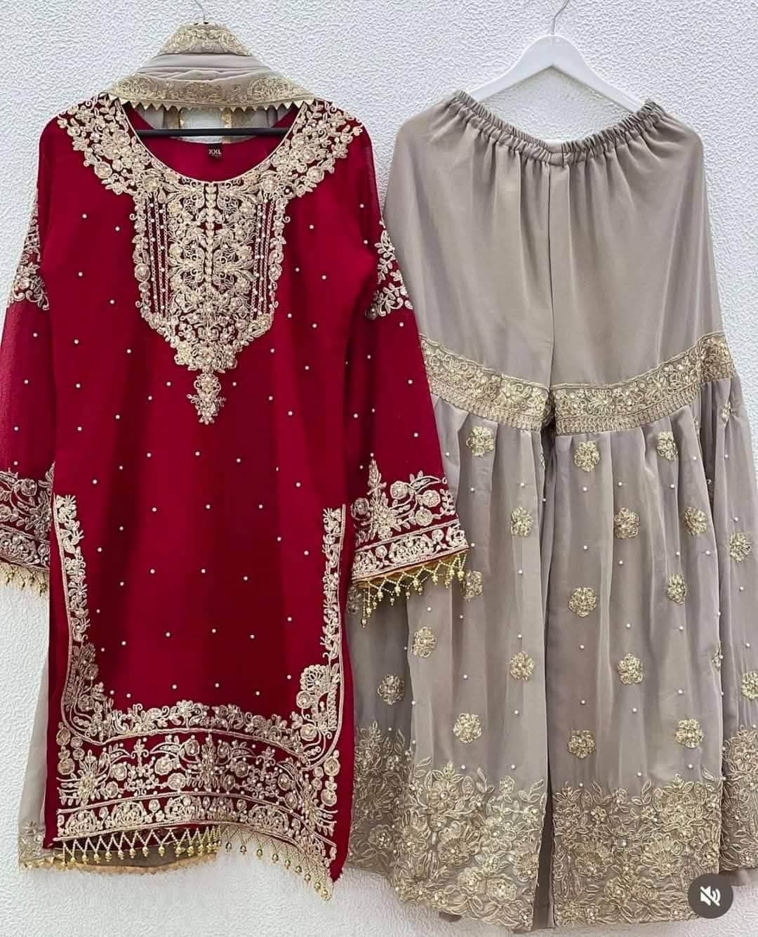 বিস্তারিত: কাপড়: জামা: চিনন কাপড় সাথে গরজিয়াস এমব্রয়ডারী এবং স্টোনের কাজ করা। গারারা: চিনন কাপড় সাথে গরজিয়াস এমব্রয়ডারী এবং স্টোনের কাজ করা। ওড়না: জরজেট কাপড় সাথে গরজিয়াস এমব্রয়ডারী এবং স্টোনের কাজ করা। সাইজ: 34-36-38-40-42-44